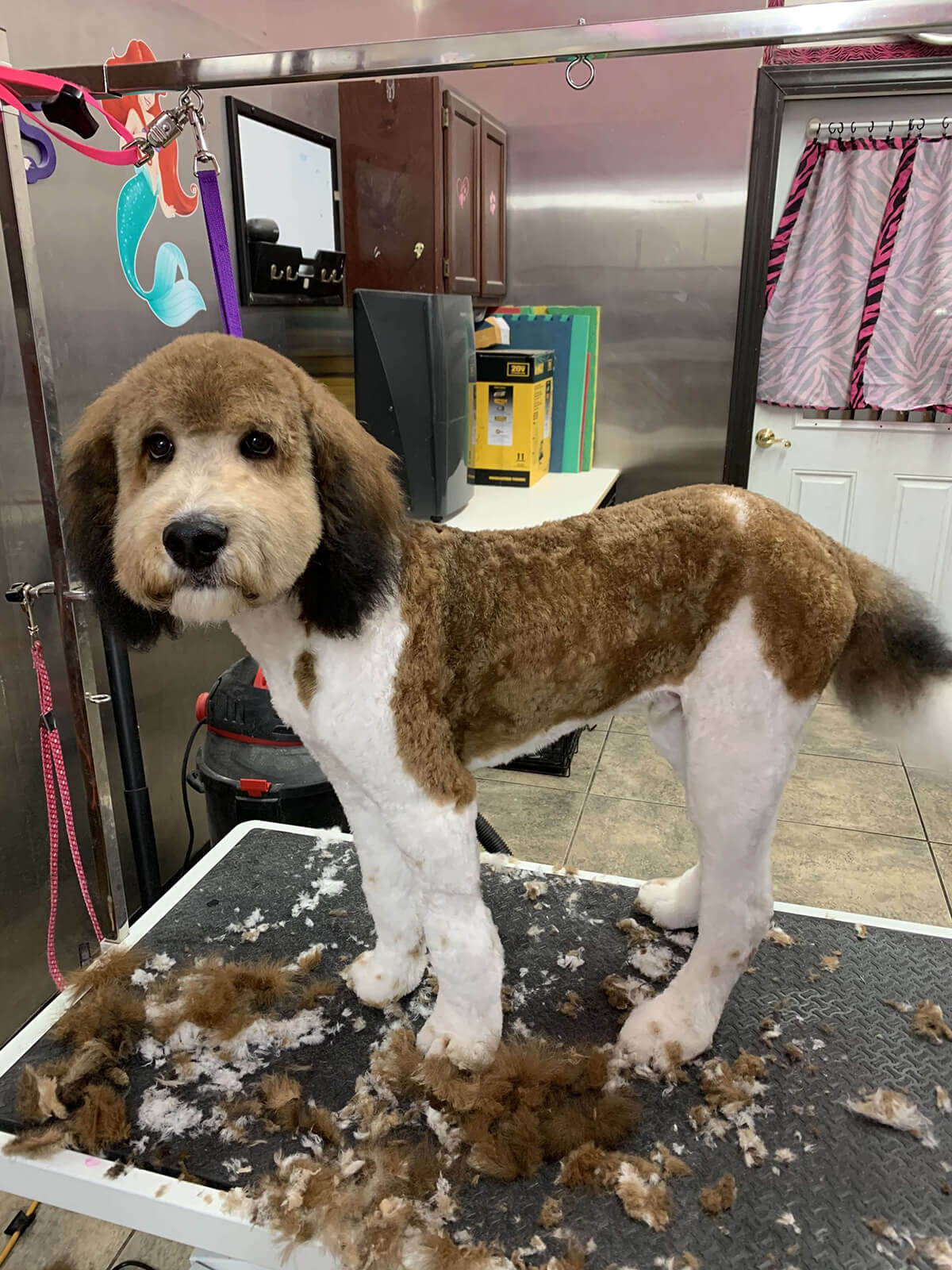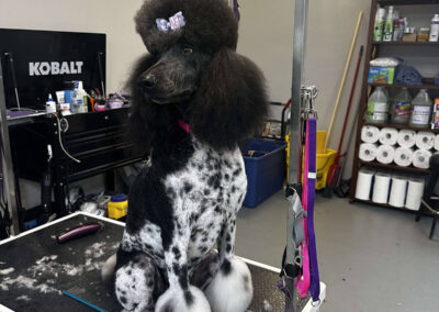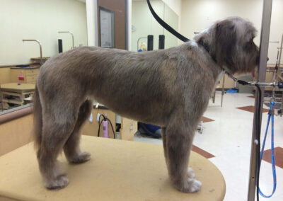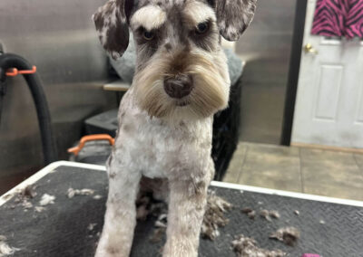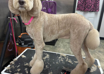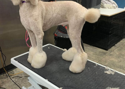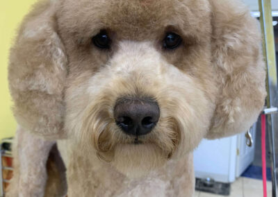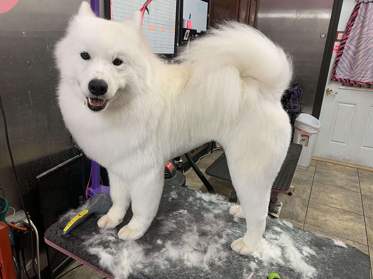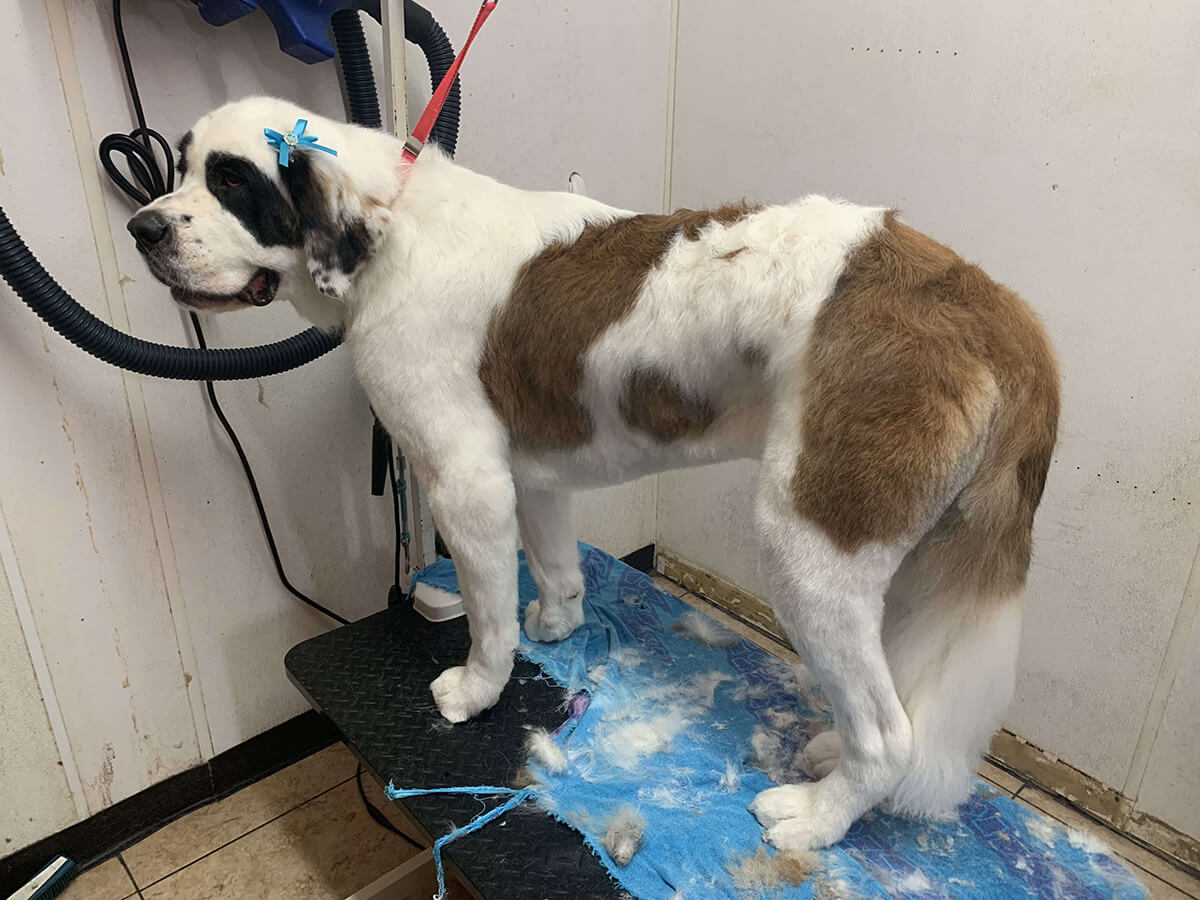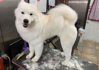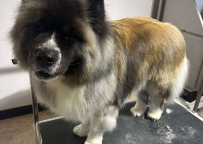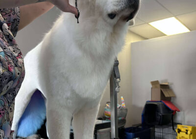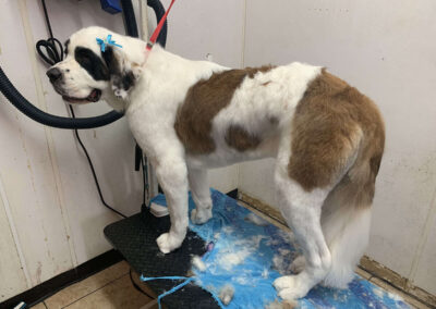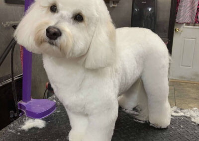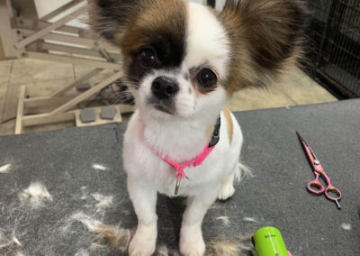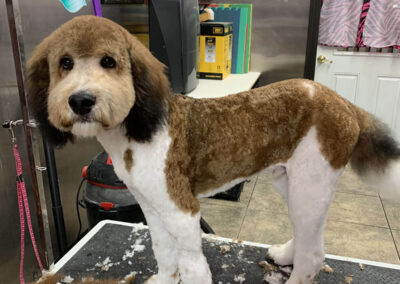 Matting is when hair gets tangled up tightly. Debris, dirt, and dander get trapped underneath which can lead to skin conditions or irritations. When matting is severe enough it can cause bruising, sores, or hot spots to develop after the matting is removed. As groomers our job is to protect the safety of your pet at all costs which means we have to cut under the matting. If we cut through the matting the dog can easily get cut because skin gets pulled into the matting. Most hairy dogs need to be groomed a minimum of every 8 weeks for a shorter cut. If the client wishes to have a longer cut that is maintainable, but the dog should be groomed every 4 weeks so we can work together to keep their coat healthy and mat free.